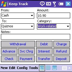 I like to keep a careful record of travel expenses in case they are either tax deductible or reimbursable. For that purpose, I depend on Keep Track Professional Edition, which allows me to transfer the data from my handheld to the desktop version and vice versa. It keeps a record of expenditures from all manner of accounts from checking to credit/debit, ATM, and savingseven cash as well as transfers and deposits.