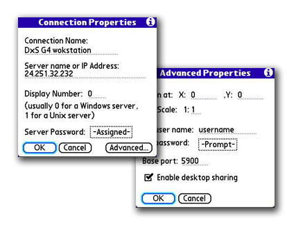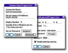 In the config menus, tap "New", then enter in the connection name, IP address, display number (usually 0), and your login password. Tap "Advanced" to set up X and Y-axis for the screen display, screen scale (this can be changed later, even while VNC is connected and running), Base Port, and Desktop Sharing. Desktop sharing means that, if turned on, another client can initiate VNC connections. Leave it on if you want to be able to use VNC from your laptop and still keep your Treo connection open, or if other people need to be able to access your machine, otherwise turn it off.