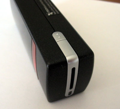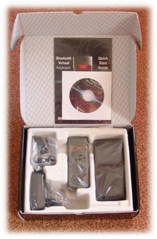 The business side of the VKB is the front, where a slim red window houses a ruby red laser beam that projects a slightly non-standard but full-sized "virtual" QWERTY keyboard on any hard, flat surface. It reminded me of Gort with his visor raised. Below that is a dark plastic window which uses Infrared to intercept your finger movements across the projected keys and transmit them as keystrokes to your computer, Treo or other kinds of handhelds.