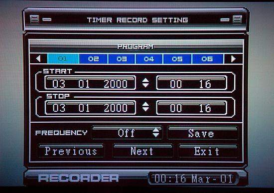 -With a VCR, when you've used a timer to record a show, afterwards the VCR timer clears itself, but on the Neuros, the timer doesn't go away or zero out, so if you record a show today, even after the recording is finished and you look at its interface tomorrow or next week, today's timer is still there. They should fix this so it's more VCR-like and a timer goes away after use.