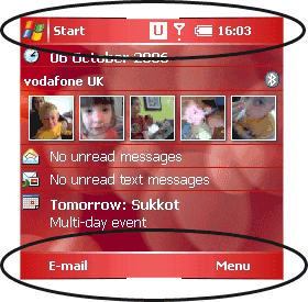 What I dislike is the bottom bar, it's a waste of valuable pixels. On the right we nearly always see "menu." In my opinion "menu" simply should have been permanently set to the button below it. To the left is the context-sensitive button. In Contacts it says "new," In Calendar it allows you to change views, and in Outlook Mobile it again changes to "new." In between this brilliant waste is an icon to bring up a virtual keyboard. On the Treo, a virtual keyboard is, how shall we say, a bit redundant. Occasionally it's helpful for the odd character that's not on the keyboard and you can't remember the special key combination. The only built-in application that allows you to go full-screen is Pocket Internet Explorer. If other applications were full-screen capable I wouldnt have a problem with the menu bar.