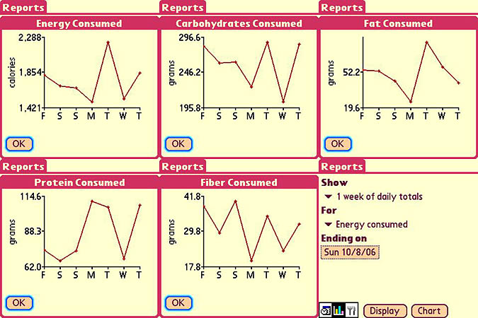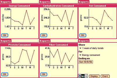 The app is close kin to the companys Nutrition and Exercise Manager for Windows and Mac OS, and will sync with it so you only have to maintain one set of data. For Windows Mobile Treos, only the companys (enormous!) foods database is available, not the Diary. That lets you look up the foods and inspect how bad (or good) they are for your diets goals, but doesnt keep track of daily totals or perform any of the neat graphing functions.
