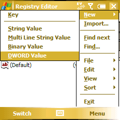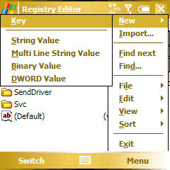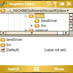 So let's navigate to the "Settings" key, uh... Not there? Aha, Treouser7 states "Please note that the 'Settings' key may not exist in your device, and thus may have to be created first." So let's put the focus on "HKLM/Software/Microsoft/Inbox" and then hit the menu button, new, Key.