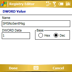 HKLM/Software/Microsoft/Inbox/Settings/SMSNoSentMsg = 0 (DWORD decimal)