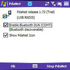 At a more remote rest area with no hotspot, there was a cell phone connection, and I desperately needed to transmit a file from my Toshiba M400 Tablet PC. Verizon has disabled the modem feature on the Treo 700w. Sprint allows it, but you have to download a special applet that I havent done yet. Luckily, I had PDANet (Info Buy) on both devices, so I was in luck. I used my Treo as a modem to connect my Tablet PC to the Internet.