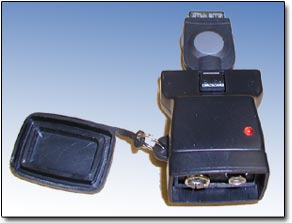 The housing is what you plug everything into: it is basically the hub of this device. On one end you plug the connector; on the other you plug the 9V battery or cigarette adapter. There is a small red LED on the top which lets you know that the device is receiving power. The case comes with a small cover to protect the battery connectors when the device is not being used.