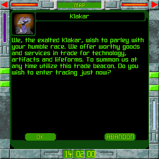 Your equipment might not be good, but it's generally enough to get you to the Klakar, who are generally waiting in a nearby yellow star system, and they are always eager to trade with you. They give you a Klakar Beacon, which you can use to summon them at any time (including during combat).