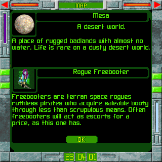 You can pick up allies in your journey, and some allies will even join your cause for free. Most are mercenary, however, and will want some sort of recompense for aiding you. You tell ships what to do in the combat screen by clicking on their ship and dragging where you want them to go or clicking on the enemy you want them to attack. Sometimes they attack intelligently, sometimes they don't. Left to its own devices, your ship will often attack in fits and spurts. There is no way to manually aim guns on your ship, it's all done for you. The addition of a ship computer can help your ship attack more intelligently. Indeed, a ship computer is almost necessary if you want to use beam weapons like lasers or ray guns. Without one, you're often stuck watching your ship flail around spastically. There will unfortunately be times in combat when it is best to walk away from the screen for a few minutes while your ship attacks on autopilot, or bank away and re-attack. You'll be able to recognize these times by the fact that your ship is running circles around the enemy ship and looks like it's having a panic attack, seizure, or similarly unfortunate medical episode. Score another one for realism.