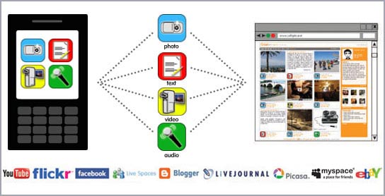 The mobile application allows you to post content from your device to multiple sites simultaneously. From the Palm OS device, you can select to post text, photos, and videos as well as audio content.